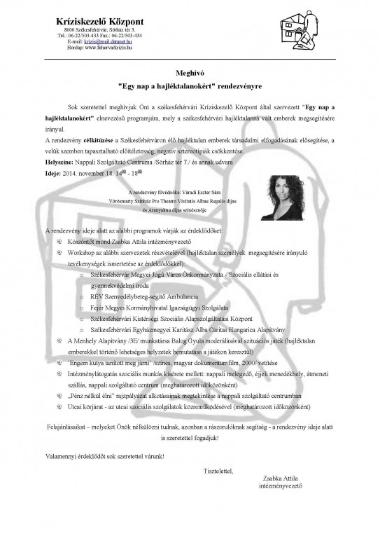 Galériák > Események, programok galériája > "Egy nap a hajléktalanokért" MEGHÍVÓ
