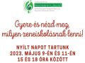 Szülők és leendő zeneiskolás gyermekeik közösen pillanthatnak be a zeneiskolai életbe. Május 9-én és május 11-én 15 és 18 óra között nyílt egyéni hangszeres és csoportos órákra mehetnek be az érdeklődők. Kedden a vonós-, csütörtökön a fúvószenekar próbája is látogatható.